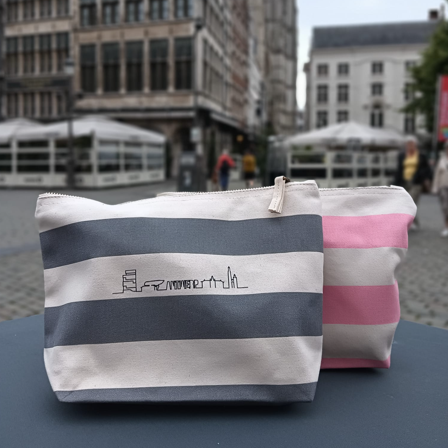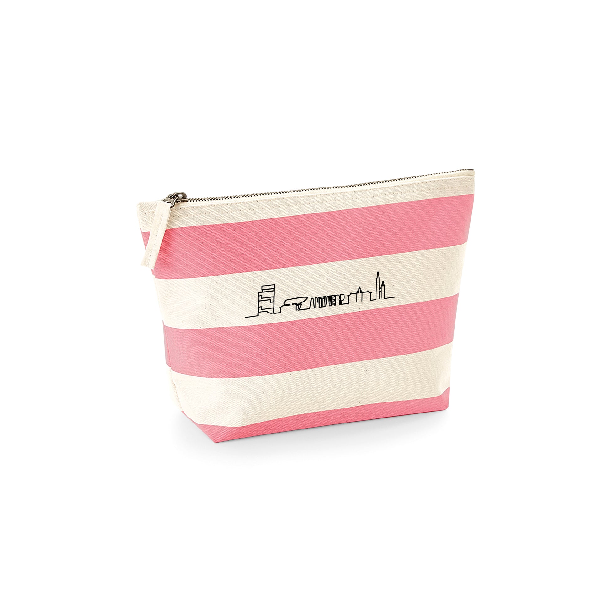 Breng een vleugje stedelijke flair in je dagelijkse routine met onze stijlvolle toilettas, ontworpen met elegante strepen in grijs, navy blauw of roze. De iconische skyline van Antwerpen is subtiel gedrukt op één van de witte strepen, waardoor deze toilettas niet alleen praktisch, maar ook een echte blikvanger is.